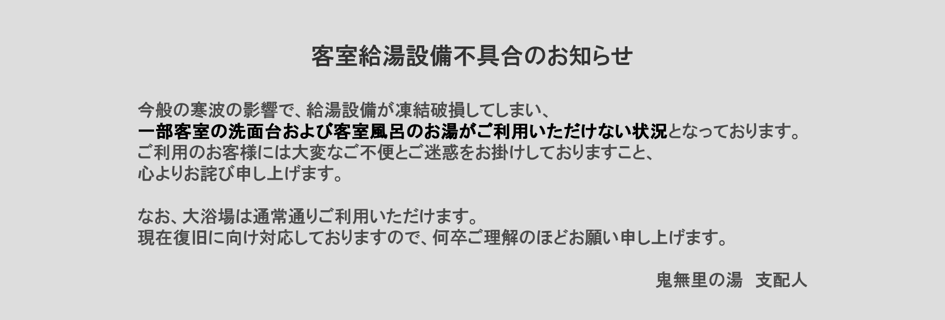 | 日帰り利用時間 | 11:00~21:00(最終入館 20:00) |